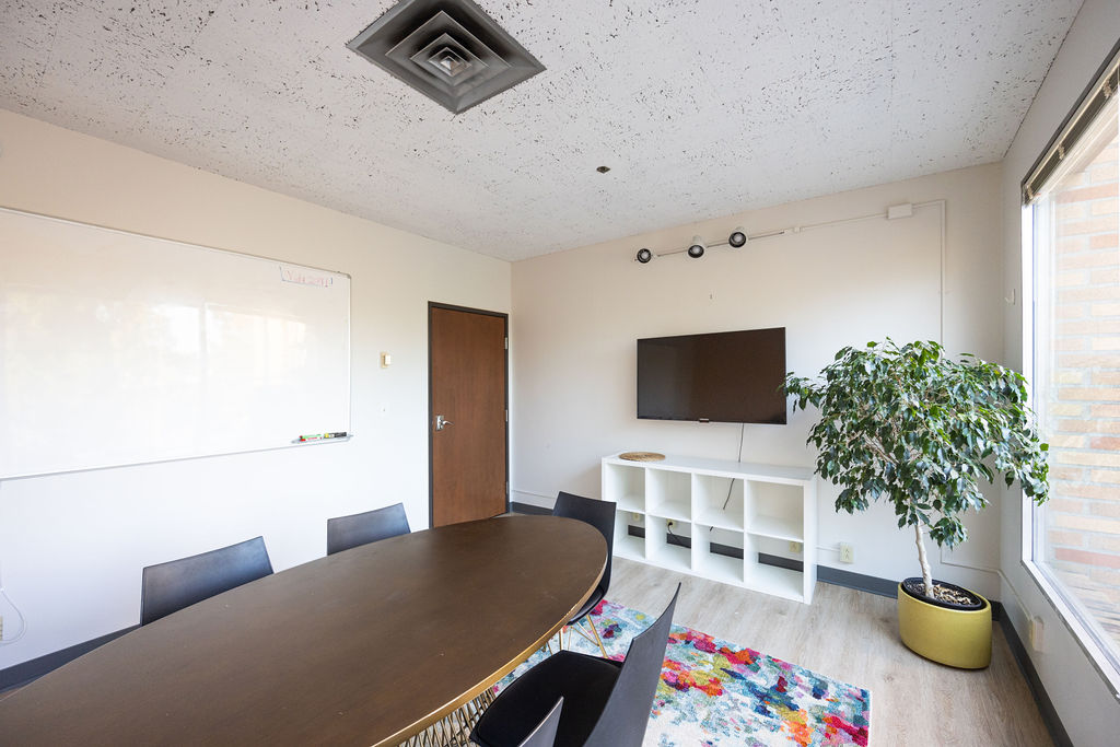 The Visionary Conference Room is built for smaller collaborations of six people or less. This meeting room is equipped with an oval table and six chairs. Plus, an oversized whiteboard provides a blank canvas for collaboration and brainstorming. The meeting space also includes a large TV and a small sitting area for more intimate discussions.