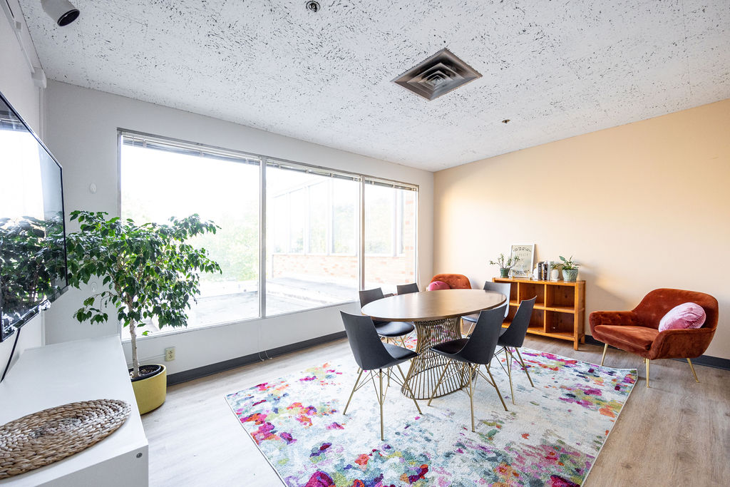 The Visionary meeting room is located in a private area between VIDA’s main coworking space and the West Wing. This means it’s conveniently located near the kitchen for beverage and snack breaks. Like the Vintage Boardroom, this space comes with access to coffee, tea, filtered water and an assortment of healthy snacks. Also similar to Vintage, the Visionary has tons of natural light that pours into the space, which features live plants, colorful decor and plush seating.